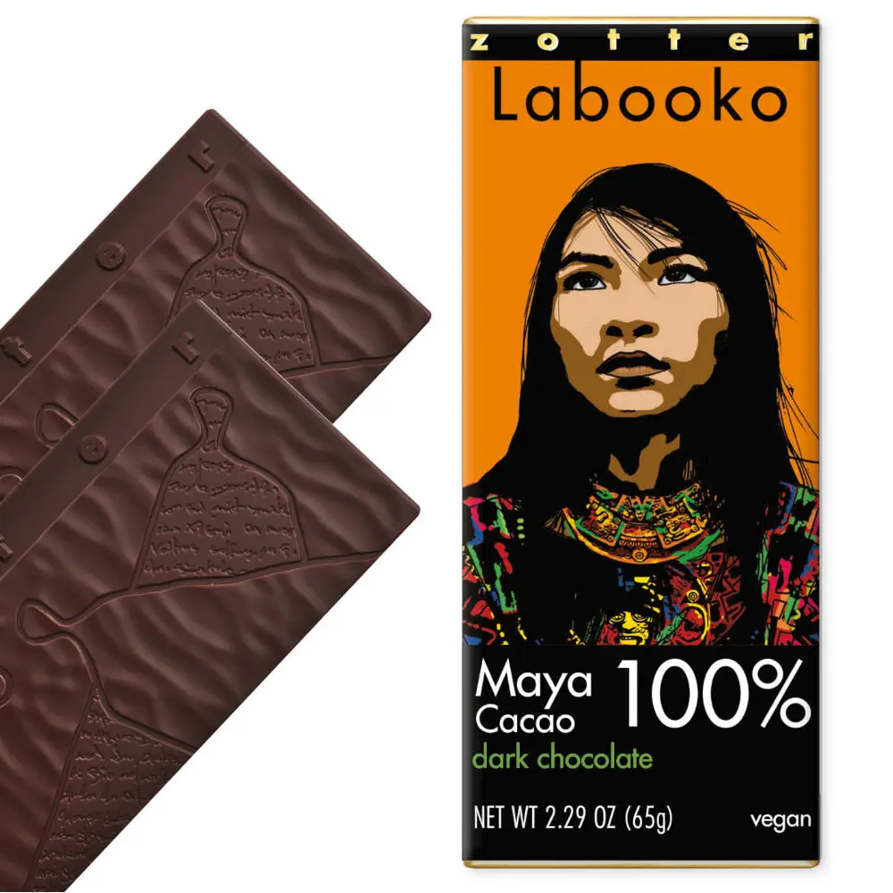 Snack on a piece of Maya culture. Made with cacao from Belize and Guatemala, where the Maya, who are the originators of chocolate culture, still live and cultivate their cacao. We’ve visited them and we are in awe of this wonderful, unique cacao legacy.