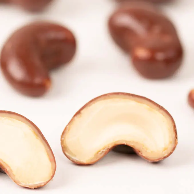 The cashew nut’s fat content isn’t very high, in contrast to other types of nut, but it has hidden superpowers. Here at Zotter, we freshly roast the cashews and coat them in a homemade cashew praline mixed with delicious milk chocolate. The whole thing is then covered in a mirror-glaze of chocolate praline.
