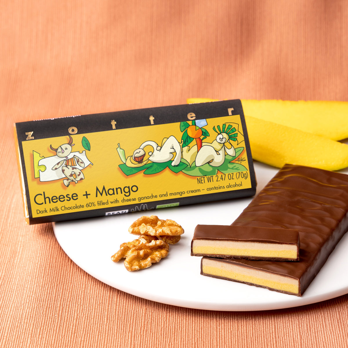 A fruity and savory-sweet cheese chocolate: a creamy cheese ganache made with soft cheese, homemade walnut praline, a touch of grappa, paired with a mango chutney layer crafted with Preda mangoes, lime juice, Zotter Muscaris wine, and a generous blend of spices. All enveloped in rich milk chocolate with 60% cacao content.