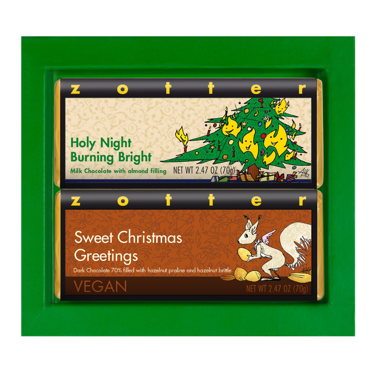 Surprise your loved ones, friends, colleagues, or boss with a Zotter Chocolate Gift Set filled with 2 delicious hand-scooped chocolate bars. The bars included are listed below.