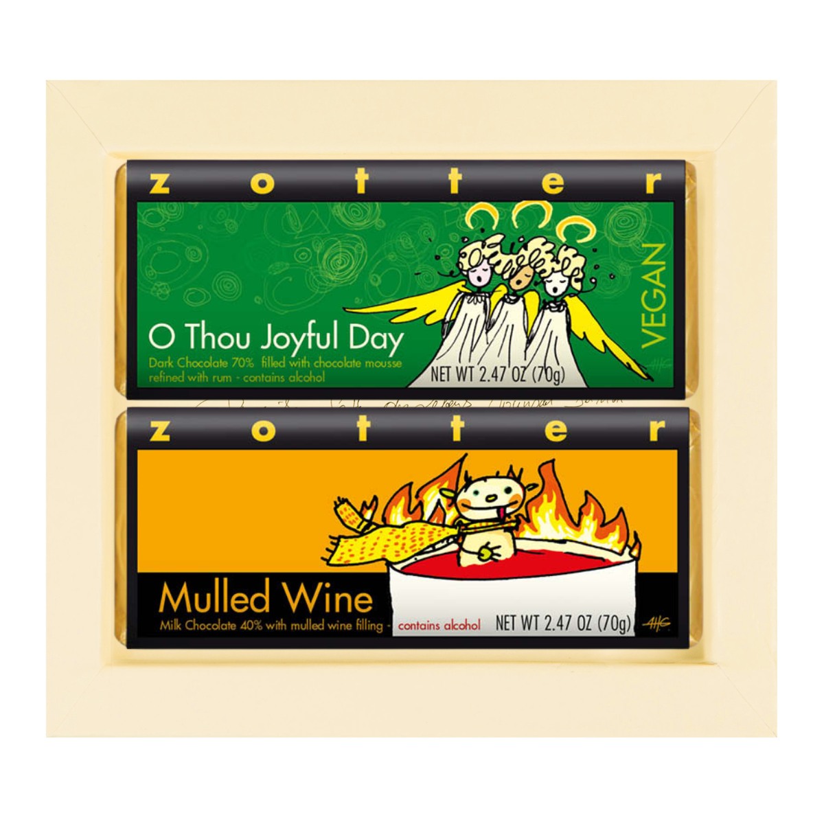 Surprise your loved ones, friends, colleagues, or boss with a Zotter Chocolate Gift Set filled with 2 delicious hand-scooped chocolate bars. The bars included are listed below. Contains Alcohol