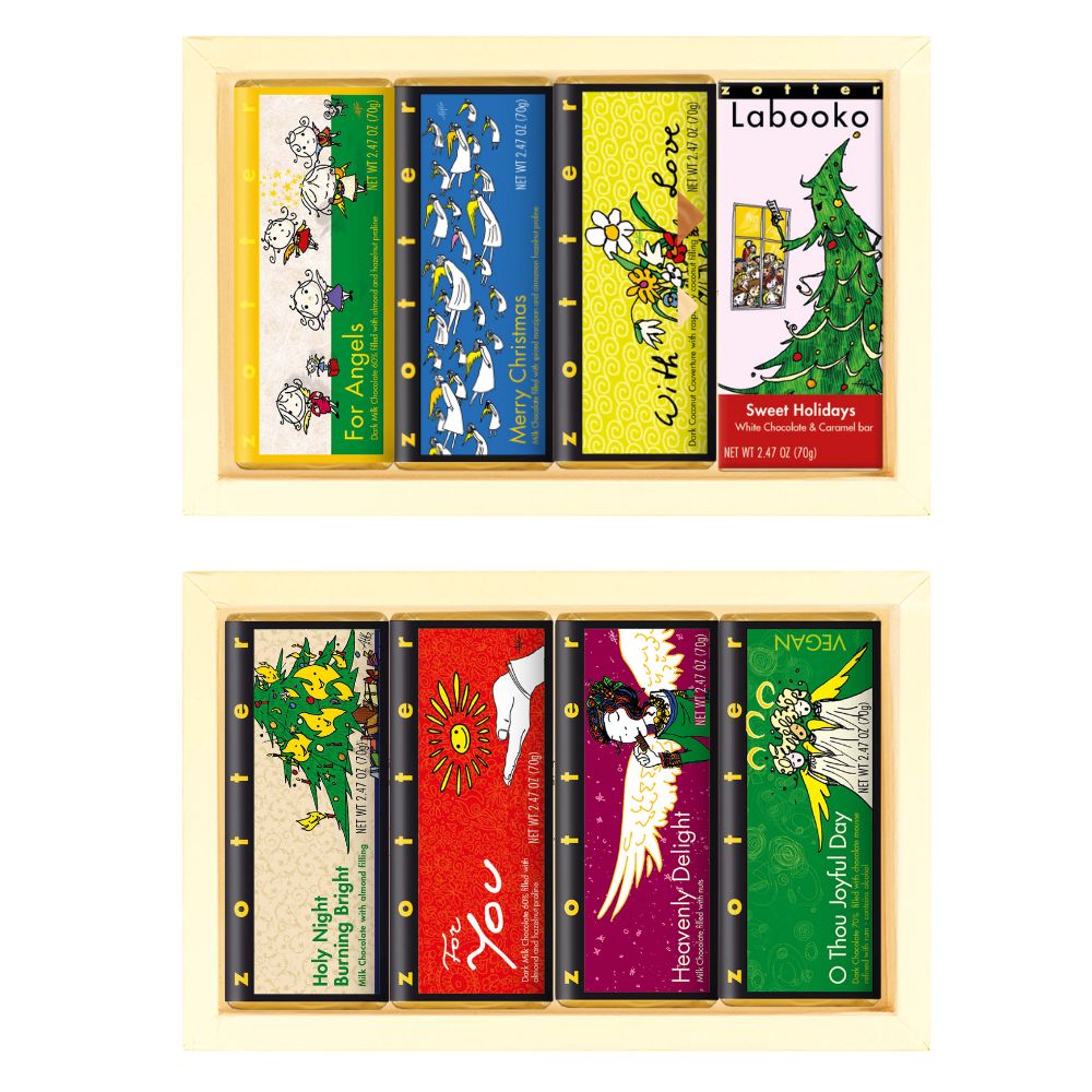 A festive gift set with 8 Zotter Chocolate bars. The included bars are listed on this page. Two bars contains Alcohol (Mulled Wine, O Thou Joyful Day)