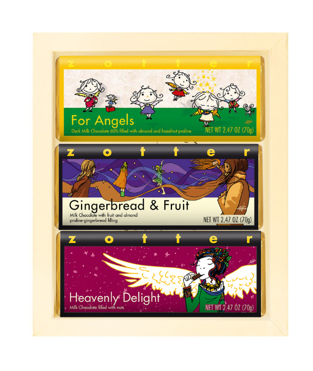 A Gift set with 3 Zotter Chocolate bars. The included bars are listed on this page.