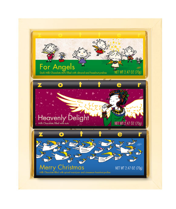 A Gift set with 3 Zotter Chocolate bars. The included bars are listed on this page.