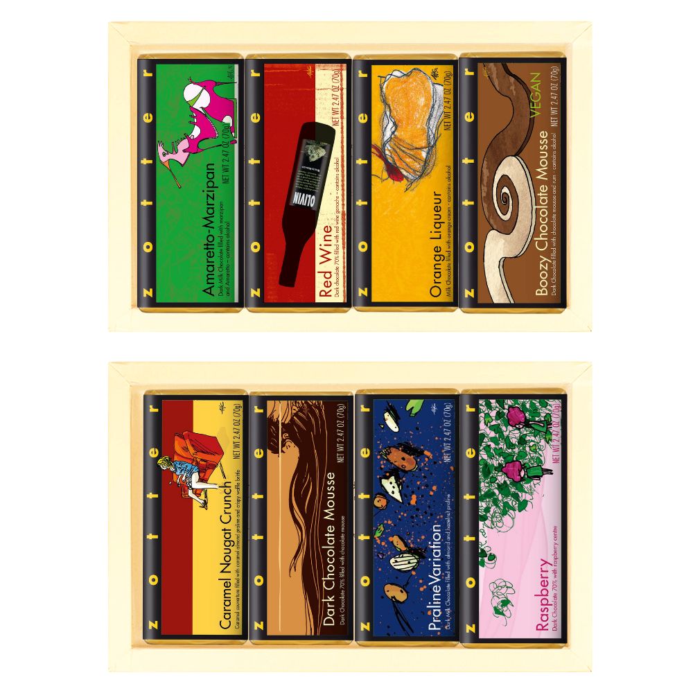 There is something for everyone in this delightful gift set. Eight of the best hand-scooped bars Zotter has to offer! Includes 2 beautiful Zotter gift boxes with a clear cover and free shipping.