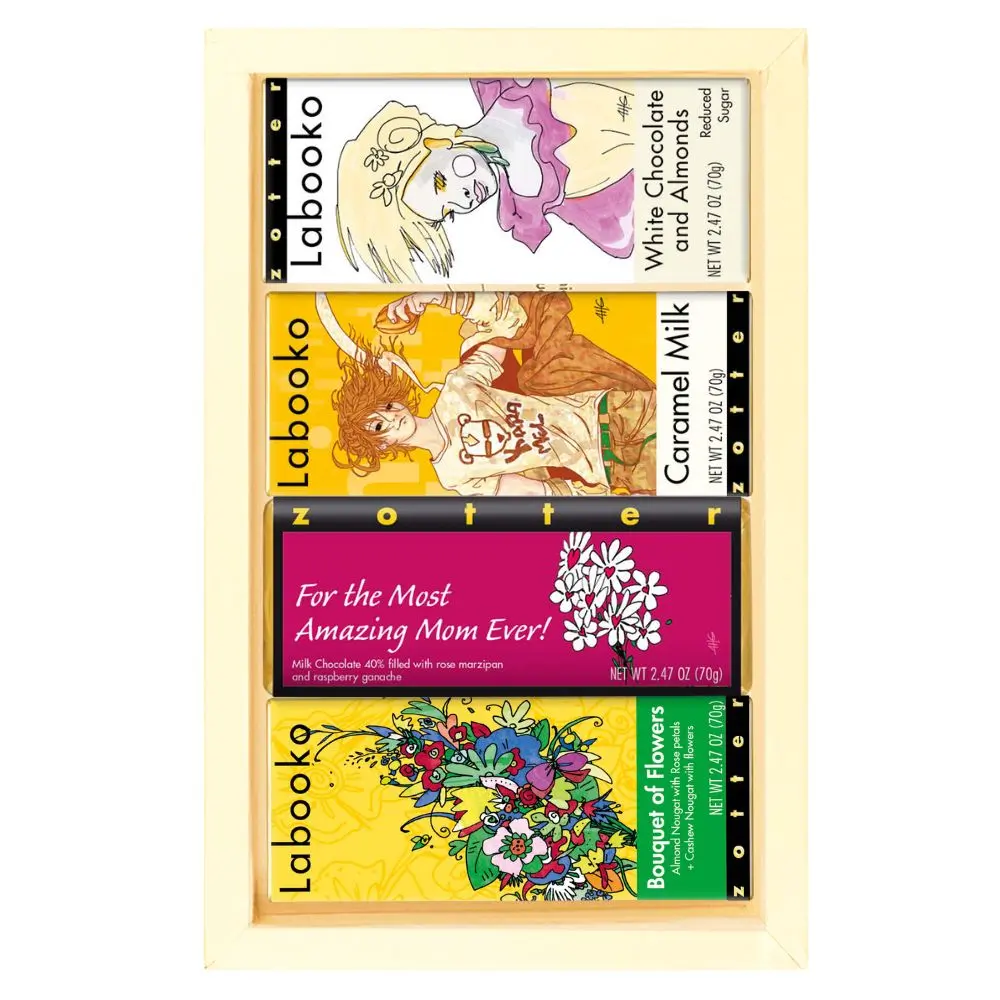 Four exciting Zotter hand-scooped flavors in a beautiful gift box with a clear cover!
