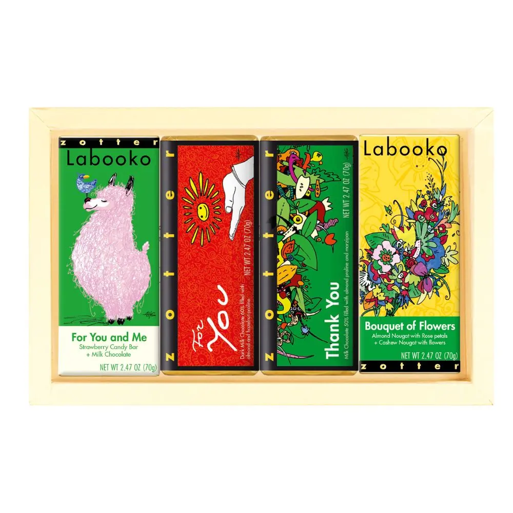 A gift created to show someone how special they are to YOU! Four Zotter bars nicely displayed in a beautiful gift box with a clear cover.