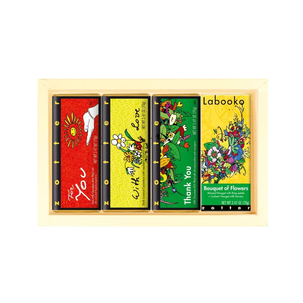 Surprise your loved ones with a Zotter Chocolate Gift Set filled with four delicious chocolate bars. Included bars are listed below.
