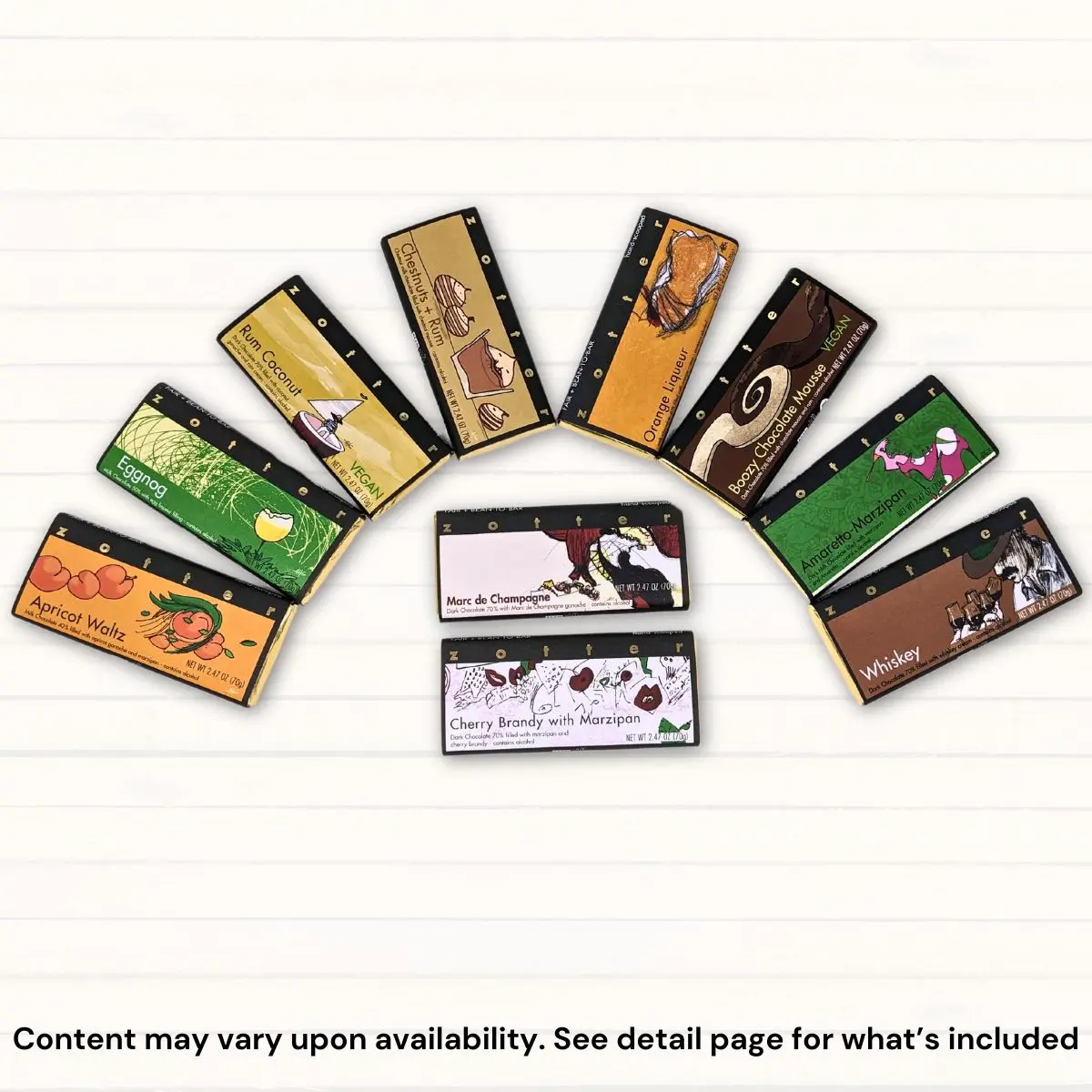 The Zotter Discovery Pack. Get a selection of hand-scooped and Labooko bars. Bars may contain alcohol. Content is subject to change upon availability.
