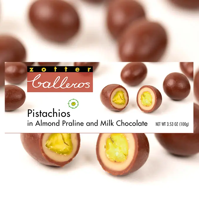 Pistachios in Almond Praline and Milk Chocolate with Milk from the Alps