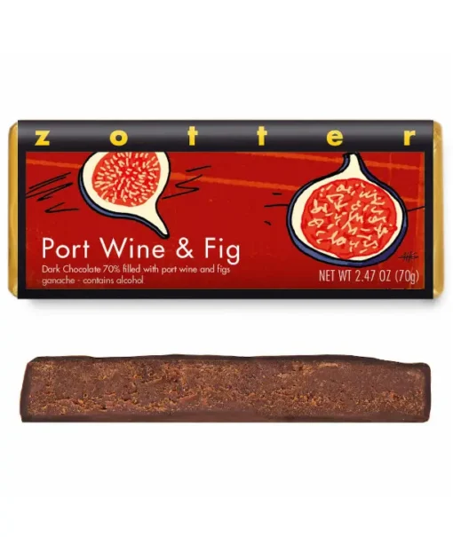 Figs in port are a timeless classic, to which we add the delicate taste of maple sugar. We begin with a Portuguese Reserve Ruby Port by Romariz, with an extremely fruity flavor, matured in oak barrels. We flow the port into a creamy, dark port ganache, and add bits of fig that have been marinated in port for a fruity and crunchy surprise. Covered in 70% dark chocolate, and sweetened only with maple sugar!