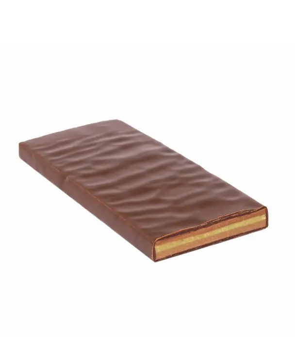 The praline melts on the tongue. A dark chocolate filled with three different types of praline: one layer of hazelnut praline, topped by a green pumpkin seed praline, and crowned by a tender-melting walnut praline. This nutty classic is completely vegan.