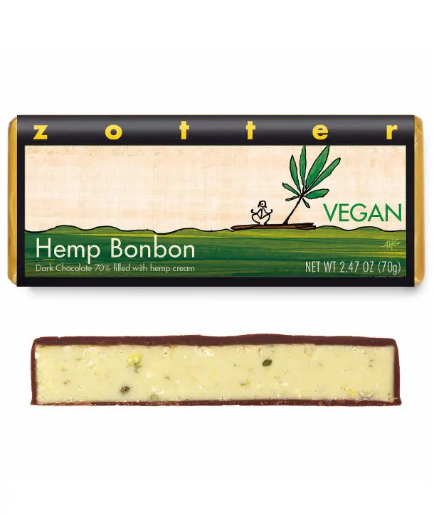 The power pack: hemp praline with caramelized hemp seeds full of energy. On top sits a thin layer of white coconut couverture and it’s covered with dark chocolate with a 70% cocoa content. Completely vegan and so delicious!