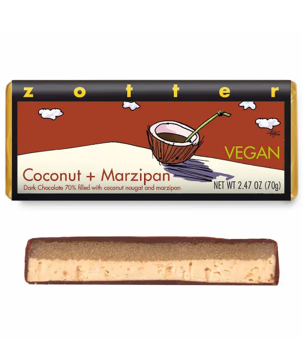 Sweet Dreams: a fine almond marzipan, combined with a crispy coconut praline layer with roasted coconut flakes. Covered in dark chocolate with a 70% cocoa content. A sweet and completely vegan creation!