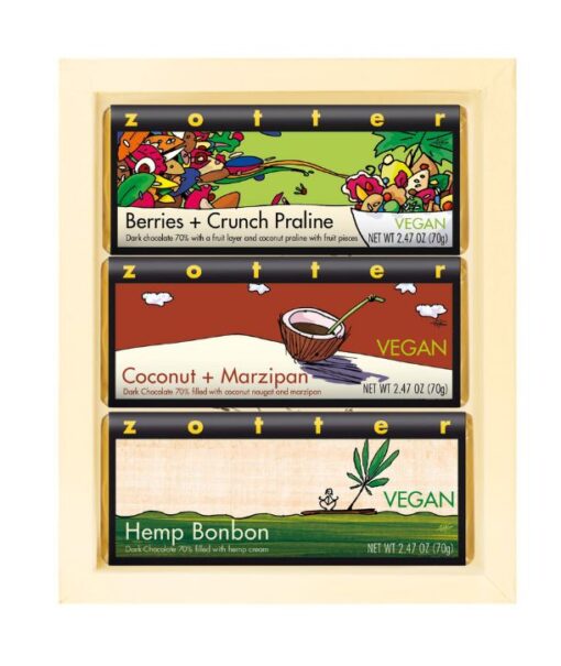 Surprise your loved ones, friends, colleagues, or boss with a Zotter Chocolate Gift Set filled with 3 delicious hand-scooped chocolate bars. The bars included are listed below.
