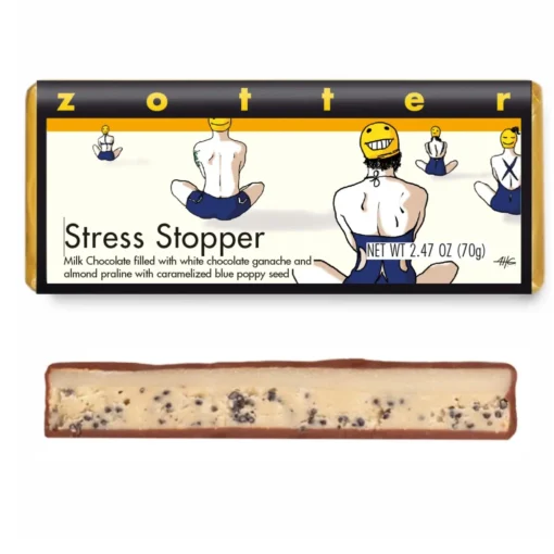 Simply switch off and enjoy: a sweet bonbon ganache made from white chocolate with a fine vanilla flavor combined with an almond praline layer popping with caramelized, excitingly fizzy blue poppy seed. It’s all covered in a delicious milk chocolate with a 40% cacao content.