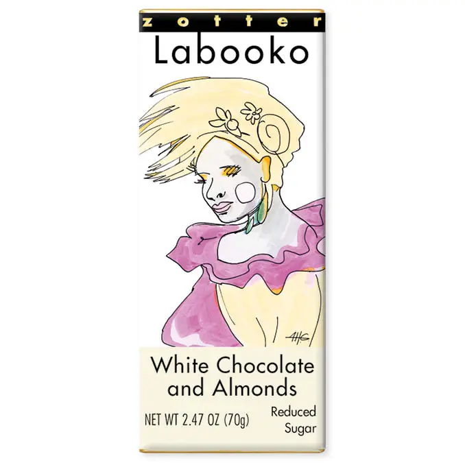 A white chocolate without an overwhelming sweetness but with an intense milky character, created with aromatic, organic Milk from the Alps, some genuine vanilla, and pure cocoa butter. The sugar is partially substituted by almonds, ground so finely that their texture isn’t noticeable. What remains is an elegant and subtle almondy sweetness.