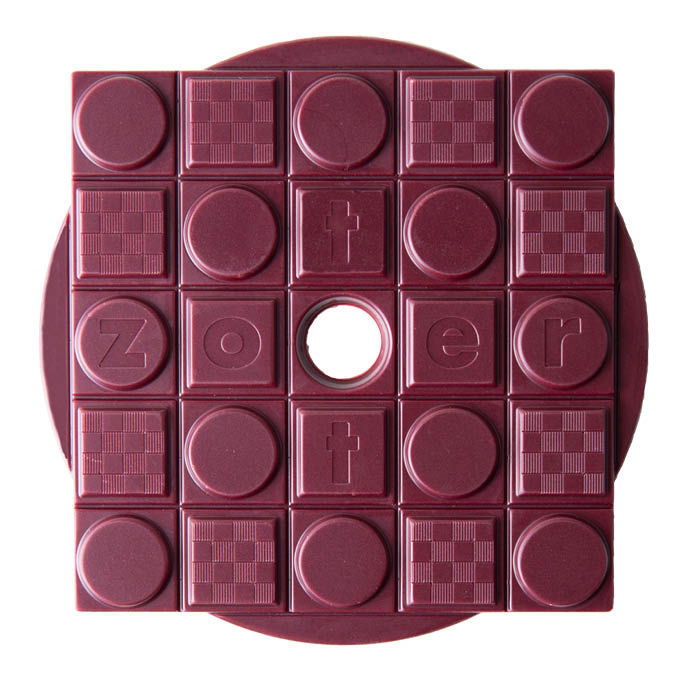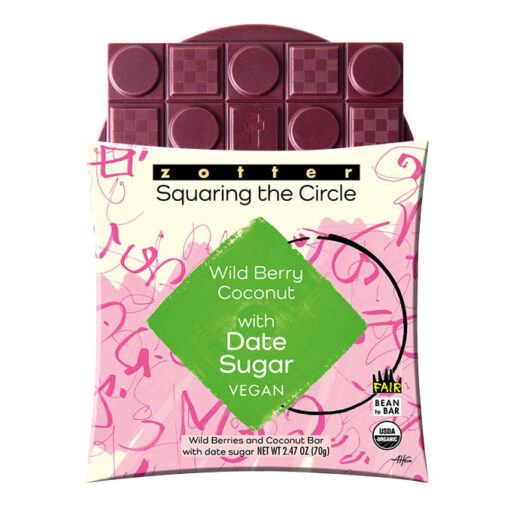 a purple fruit bar, created from a white coconut couverture and filled with raspberries and blueberries, which lend this delicious creation its stunning color and intense berry flavor. Sweetened only with date sugar from dried dates, a cane-sugar alternative with fine notes of caramel. Finally, a dash of lemon and pure cocoa butter for the melt.